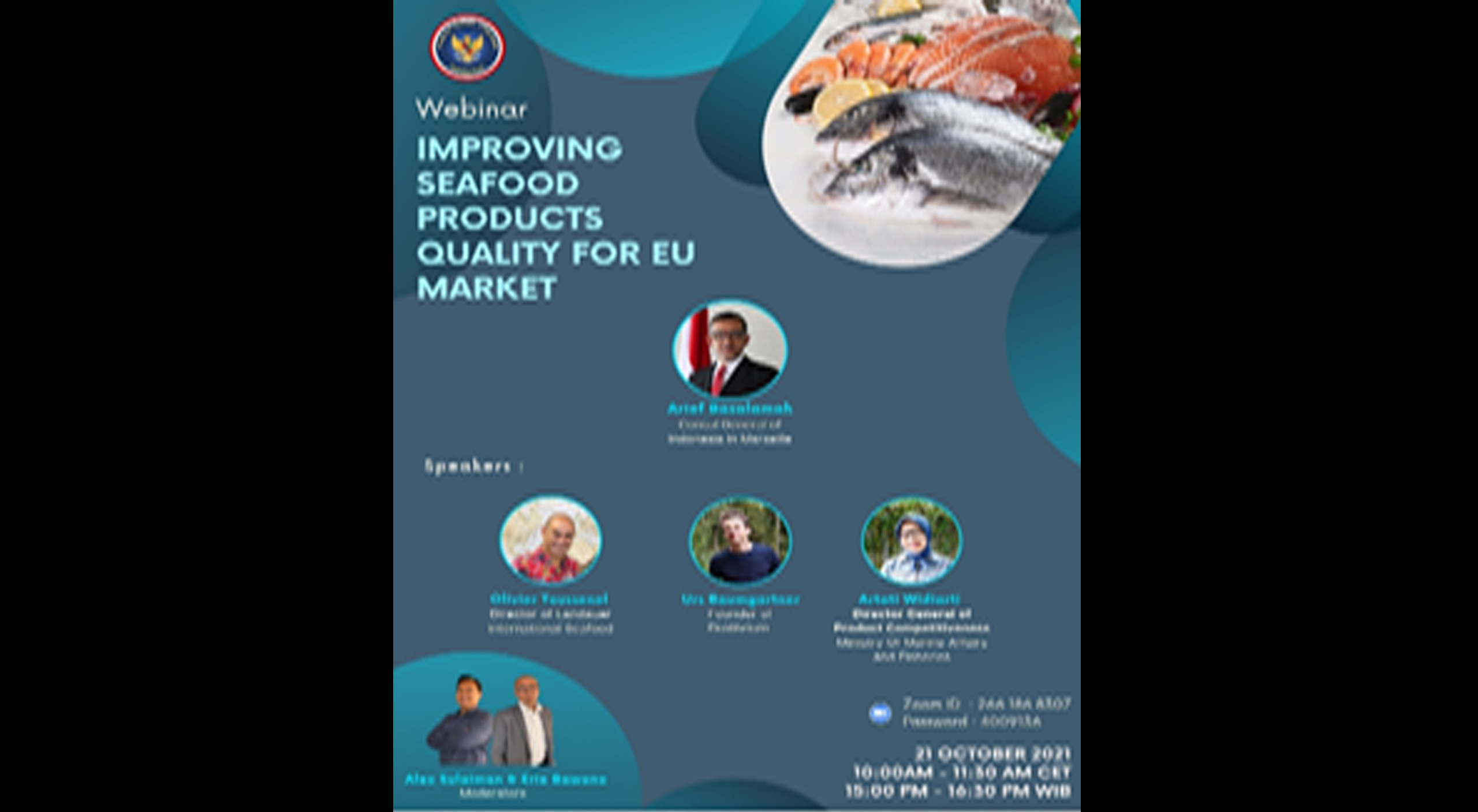 Dalam rangka peningkatan akses pasar produk kelautan dan perikanan ke Pasar Uni Eropa, Direktorat Jenderal Penguatan Daya Saing Produk Kelautan dan Perikanan Kementerian Kelautan dan Perikanan bekerjasama dengan Konsulat Jenderal Republik Indonesia di Marseille Prancis mengadakan Webinar dengan tema “ Improving Seafood Quality for the EU Market “. Bagi Indonesia ekspor produk kelautan dan perikanan menjadi salah satu perhatian utama pemerintah karena Indonesia merupakan salah satu negara pengekspor produk perikanan terbesar di dunia dengan tujuan ekspor utama antara lain adalah Amerika Serikat, Tiongkok, Uni Eropa, Timur Tengah, dan negara-negara ASEAN. Menurut ITC Trademap, nilai ekspor produk perikanan Indonesia 2020 mencapai USD 5,2 miliar atau tumbuh positif 5,7% dibandingkan tahun 2019. Hal ini menunjukan tren yang sangat positif bagi Indonesia mengingat negara-negara utama eksportir produk perikanan dunia justru cenderung mengalami penurunan nilai ekspor ditengah disrupsi akibat pandemi covid-19. Meski demikian, produk kelautan dan perikanan Indonesia masih kerap mendapat penolakan produk karena berbagai sebab diantaranya seperti kualitas dan mutu produk yang tidak sesuai dengan standar yang ditetapkan di negara importir. Penanganan transportasi produk hasil laut yang tidak sesuai dengan cara yang baku membuat kesegaran ( freshness ) produk menjadi tidak terjamin. Webinar ini diadakan dengan tujuan untuk membahas bagaimana mempertahankan keunggulan produk perikanan Indonesia di kancah global dan mengidentifikasi kekurangannya untuk menghasilkan usulan perbaikan yang akan ditangani secara Bersama. Selain itu, untuk meningkatkan kualitas produk perikanan dibutuhkan penanganan dari hulu yang tepat dalam arti para pelaku ( stakeholders ) harus memiliki keahlian yang baik. Dalam kaitan ini, perlu peningkatan keahlian suber daya manusia sehingga produk Indonesia lebih bersaing. Narasumber yang terlibat dalam Webinar ini adalah Mr. Olivier Toussenel – Direktur Landauer International Seafood yang menyampaikan pengalamannya bekerjasama dengan Indonesia dan memberikan update informasi untk meningkatkan kualitas produk perikanan Indonesia agar dapat sesuai dengan standarisasi di Prancis dan Uni Eropa. Narasumber lainnya adalah Mr. Urs Baumgartner – Pendiri Ekolibrum, yang merupakan ahli dibidang lingkungan, komunitas local, dan pembangunan yang adil. Presentasi yang dibawakan tentang pendekatan holistic yang mengintegrasikan aspek social, lingkungan, dan ekonomi untuk keperluan pengembangan kegiatan bisnis yang berkelanjutan dan ramah lingkungan. Dirjen Penguatan Daya Saing Produk Kelautan dan Perikanan ( PDSPKP ) Kementerian Kelautan dan perikanan – Artati Widiarti, menjelaskan mengenai strategi pemerintah RI dalam pengembangan daya saing produk kelautan dan perikanan dalam kerangka meningkatkan nilai ekspor produk laut ( seafood ) Indonesia ke luar negeri. Webinar in dibuka oleh Konsul Jenderal RI di Marseille – Arief.