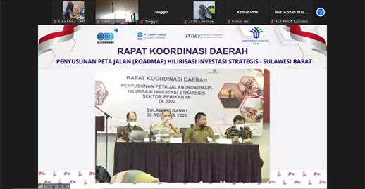 Sehubungan dengan kegiatan Penyusunan Peta Jalan ( Roadmap ) Hilirisasi Investasi Strategis tahun Anggaran 2022 yang dilaksanakan oleh Kementerian Investasi/BKPM bekerja sama dengan KSO Sucofindo – Indef – Amythas, Kementerian Investasi/BKPM mengadakan Rapat Koordinasi Daerah dalam rangka penyusunan Roadmap HIS di Provinsi Sulawesi Barat. Investasi di sektor hilirisasi berbasis sumber daya alam memiliki peran yang vital untuk mendukung sasaran strategis penanaman modal. Salah satu sektor sumber daya alam yang penting untuk dikembangkan hilirisasinya dalam rangka pemenuhan energi dan bahan baku industri di dalam negeri adalah minyak, gas bumi, mineral, dan batubara. Selain dalam bidang energi dan bahan baku industri diperlukan transformasi ekonomi Indonesia yang melibatkan pemindahan alokasi sumber daya dari sektor yang memiliki produktivitas rendah ke tinggi, yaitu melalui upaya hilirisasi perkebunan, kelautan, perikanan, dan kehutanan nasional. Investasi di sektor hilirisasi ini dinilai berdampak besar bagi pertumbuhan ekonomi Indonesia karena dari sektor energi dan bahan baku industri hingga 2030 trend kebutuhan bahan bakar minyak diperkirakan akan terus meningkat, sedangkan kapasitas kilang belum bisa memenuhi kebutuhan. Dalam rangka menangkap proyeksi peluang investasi sektor hilirisasi Kedeputian Hilirisasi Investasi Strategis, Kementerian Investasi/BKPM melaksanakan penyusunan Peta Jalan Investasi HIlirisasi. Tujuan dari penyusunan Peta Jalan Hilirisasi Investasi Strategis untuk memberikan landasan arah kebijakan dan sinergi dalam mendorong investasi hilirisasi. Penyusunan peta jalan meliputi pemetaan peluang dan tantangan komoditas strategis melalui analisis kinerja perdagangan, keterisian pohon industri, identifikasi nilai tambah produk olahannya serta tahapan hilirisasi investasi komoditas. Keluaran dari penyusunan Peta Jalan Hilirisasi Investasi Strategis ini diharapkan mampu menjadi referensi bagi Pemerintah dan dunia usaha dalam rangka hilirisasi investasi. Hilirisasi industri sektor perikanan merupakan amanah dari Rencana Induk Pembangunan Industri Nasional ( RIPIN ) 2015 – 2035 yang menitikberatkan pada pengembangan industri pangan. Sebagai amanah RIPIN perikanan sebagai sumber pangan, difokuskan pada pengawetan ikan ( beku, kering dan asap ) dan fillet serta aneka olahan ikan dan hasil laut lainnya ( minyak ikan, suplemen Kesehatan dan pangan fungsional lainnya ). Dalam rangka implementasi kebijakan tersebut diperlukan roadmap pengembangan ke depan hingga 2045. Didalam roadmap tersebut tersebut pemerintah berencana mengembangkan hilirisasi perikanan yang berorientasi pada peningkatan nilai tambah produk dan berorientasi pada pasar. Sektor perikanan akan berfokus pada pengolahan hasil perikanan dari komoditas udang, ikan ( tuna, tongkol, rajungan ), dan rajungan/kepiting. Pemilihan komoditas didasarkan atas pertimbangan bahwa nilai ekspor komoditas udang 2019 menempati urutan tertinggi dari seluruh komoditas perikanan, dengan nilai USD 1,7 juta dengan share sebesar 35% dari total ekspor perikanan di tahun 2019, diikuti oleh ikan ( TTC ) senilai USD 747,538 dan share terhadap total sebesar 15%. Sedangkan untuk Rajungan-kepiting, nilai ekspor menempati posisi ke-4 dengan nilai USD 393,498 dan market share sebesar 8% dari total ekspor perikanan. Pemilihan ketiga komoditas tersebut, tidak hanya karena mempunyai nilai ekspor yang tinggi, namun mempunyai added value yang cukup besar, baik dari produk utamanya maupun by productnya. Seperti udang, rajungan, kepiting, by productnya berupa cangkang yang potensial dimanfaatkan untuk chitin chitosan. Sedangkan untuk ikan ( TTC ), dari sisa-sisa olahan yang berupa kulit, tulang dan jeroan, dapat dimanfaatkan untuk pembuatan tepung ikan, minyak ikan, kolagen maupun gelatin. Berdasarkan pertimbangan tersebut, maka investasi perikanan kedepan diharapkan beroirentasi pada konsep bisnis hilirisasi yang terintergrasi. Dengan mengoptimalkan hilirisasi produk utama serta produk turunan. Pendekatan ini sejalan dengan konsep blue economy yang salah satunya bercirikan zero waste, adopsi inovasi, multiplier economy dan social inclusive. Dengan memanfaatkan limbah produk yang bernilai tambah, maka akan melahirkan industri yang nir limbah, menyerap tenaga kerja ( dengan adanya industri baru ), peningkatan kesejahteraan dan pentingnya pemanfaatan teknologi dan inovasi dalam menghasilkan produk bernilai tambah tinggi. Pendekatan berikutnya adalah integrasi antara perusahaan berskala menengah besar dengan UMKM dalam kemitraan sinergis yang saling menguntungkan. Pola kemitraan dalam industry pengolahan skala menengah-besar dan UMKM ini dapat terjadi pada produk utama dengan pengolahan limbahnya by productnya.