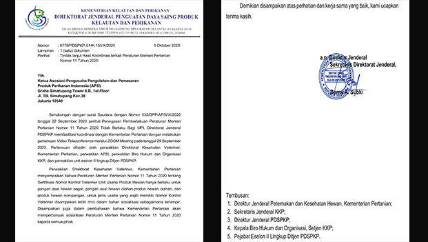 Menindaklanjuti surat dari AP5I perihal Penegasan tentang Permentan No. 11 tahun 2020 tentang Sertifkasi Nomor Kontrol Veteriner Unit Usaha Produk Hewan pasal 4, ayat 2 K : Gudang Berpendingin tidak Berlaku bagi UPI, Direktorat Jenderal Penguatan Daya Saing Produk Kelautan dan Perikanan KKP mengadakan diskusi dengan AP5I dan Kementan untuk menindak lanjuti hasil koordinasi terkait Peraturan Menteri Pertanian No. 11 tahun 2020. Hal ini perlu didiskusikan lebih lanjut karena ada pihak yang mempersoalkan UPI mengenai cold storagenya yang tidak mempunyai nomor kontrol veteriner sesuai dengan Peraturan Menteri Pertanian No. 11 tahun 2020. Dalam diskusi tersebut perwakilan dari Direktorat Kesehatan Veteriner, Kementerian Pertanian – Ira menyampaikan bahwa Permentan No. 11 tahun 2020 tentang Sertifkasi Nomor Kontrol Veteriner Unit Usaha Produk Hewanhanya berlaku untuk pangan asal hewan segar, pangan asal hewan olahan-produk hewan olahan, dan produk hewan non-pangan, untuk jenis usaha yang wajib memiliki Nomor Kontrol Veteriner.
