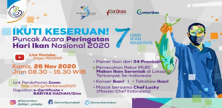 Hari Ikan Nasional ( Harkanans ) diperingati setiap tahun pada tanggal 21 November. Harkannas ditetapkan oleh Presiden melalui Keputusan Presiden No. 3 Tahun 2014 tanggal 24 Januari 2014. Penetapan Hari Ikan Nasional dilandasi dua pertimbangan yang pertama adalah bahwa Indonesia sebagai negara kepulauan, memiliki potensi perikanan yang perlu dimanfaatkan secara optimal dan lestari untuk bangsa, dan pertimbangan kedua dalam rangka meningkatkan kualitas sumber daya manusia Indonesia dan mendukung ketahanan pangan dan gizi nasional, diperlukan upaya-upaya untuk meningkatkan kesadaran masyarakat terhadap pentingnya ikan sebagai bahan pangan yang mengandung protein berkualitas tinggi. Tahun 2020 merupakan peringatan Harkannas yang ke-7, dan peringatan Harkannas tahun ini mengangkat tema “ Makan Ikan Tingkatkan Imunitas Lawan Covid dan Stunting ” dengan pertimbangan bahwa pangan dan gizi adalah hal yang saling terkait dan saat ini masih menjadi masalah nasional yang perlu diselesaikan dan juga terkait pandemi covid-19 yang memerlukan imunitas sebagai daya tangkal terhadap penularannya. Berbagai event digelar dalam rangkaian peringatan Harkannas dengan tetap memperhatikan protokol kesehatan Covid 19 dan pada puncak peringatan Harkannas digelar acara serentak yang dipusatkan di Kantor Kementerian Kelautan dan Perikanan di Jakarta dan diikuti seluruh Dinas Kelautan dan Perikanan Provinsi di Indonesia. Acara dimulai dengan makan ikan bersama secara serentak terhubung melalui aplikasi zoom yang dikomandoi dari Jakarta dan diikuti oleh seluruh Provinsi di Indonesia. Acara makan ikan ini merupakan pertama kalinya dilakukan di Indonesia, sehingga diganjar penghargaan oleh Museum Rekor Indonesia dengan menciptakan rekor baru “ Makan Ikan Serentak dilokasi terbanyak di Seluruh Indonesia ”. Penghargaan dari MURI semoga semakin menumbuhkan kesadaran masyarakat di seluruh Indonesia untuk terus mengkonsumsi ikan. Artati Widiarti – Direktur Jenderal Penguatan Daya Saing Produk Kelautan dan Perikanan dalam sambutannya mengatakan makan ikan merupakan investasi kesehatan untuk masa depan.Lebih lanjut dalam sambutannya Dirjen PDSPKP menjelaskan dengan pertimbangan bahwa pangan dan gizi adalah hal yang saling terkait dan saat ini masih menjadi masalah nasional yang perlu diselesaikan. Konsumsi ikan dianggap salah satu solusi untuk melawan stunting dan covid karena ikan mempunyai keunggulan diantaranya mengandung asam lemak Omega 3 tinggi untuk perkembangan mata, otak, dan jaringan syaraf serta memiliki komposisi asam amino lengkap, mudah dicerna dan diserap tubuh, serta sumber vitamin D dan Kalsium bagi pertumbuhan tulang.KKP terus menganjurkan masyarakat untuk mengkonsumsi ikan guna meningkatkan imunitas tubuh. Untuk itu ayo makan ikan berkualitas untuk meningkatkan imunitas.Selain makan ikan, dilakukan juga pameran virtual yang juga diikuti oleh seluruh daerah di Indonesia. Masing – masing daerah secara bergiliran menampilkan produk produk olahan unggulan yang khas dari daerah masing-masing. Berbagai inovasi menu dan produk produk olahan berbahan baku ikan ditampilkan pada pameran kali ini. Tak kalah menarik dan inovatif, KKP pada kesempatan ini melaunching aplikasi tentang Gemarikan yang bisa diakses melalui smartphone. Tinggal instal aplikasi Gemarikan dari playstore, masyarakat akan mendapatkan semua informasi yang terkait dengan Gemarikan mulai dari katalog ikan, olahan ikan, resep masakan, restoran hingga umkm perikanan. Rangkaian seminar online yang dikemas dalam format webinar juga dilakukan dalam rangka peringatan Harkannas tahun 2020 ini dan dilaksanakan secara berkala sebelum acara puncak peringatan. Pada Webinar seri ke-1, telah dibahas manfaat ikan untuk meningkatkan imunitas khususnya menghadapi pandemi COVID-19. Kemudian webinar seri ke-2, diulas tips bagaimana mengajak anak untuk lebih menyukai dan mengonsumsi ikan. Tak kalah menarik pada seri ke-3 dibahas tentang makan ikan untuk kesehatan dan kecantikan. Dan sebagai penutup pada acara puncak digelar webinar dengan mengangkat tema ikan untuk Indonesia maju.Semoga dengan adanya Harkannas yang diperingati setiap tahun membangkitkan kesadaran masyarakat Indonesia bahwa sebagai negara kepulauan, bangsa kita memiliki potensi perikanan yang perlu dimanfaatkan secara optimal dan lestari untuk bangsa. Selain itu dalam rangka meningkatkan kualitas sumber daya manusia Indonesia dan mendukung ketahanan pangan dan gizi nasional, diperlukan upaya-upaya untuk meningkatkan kesadaran masyarakat terhadap pentingnya ikan sebagai bahan pangan yang mengandung protein berkualitas tinggi.