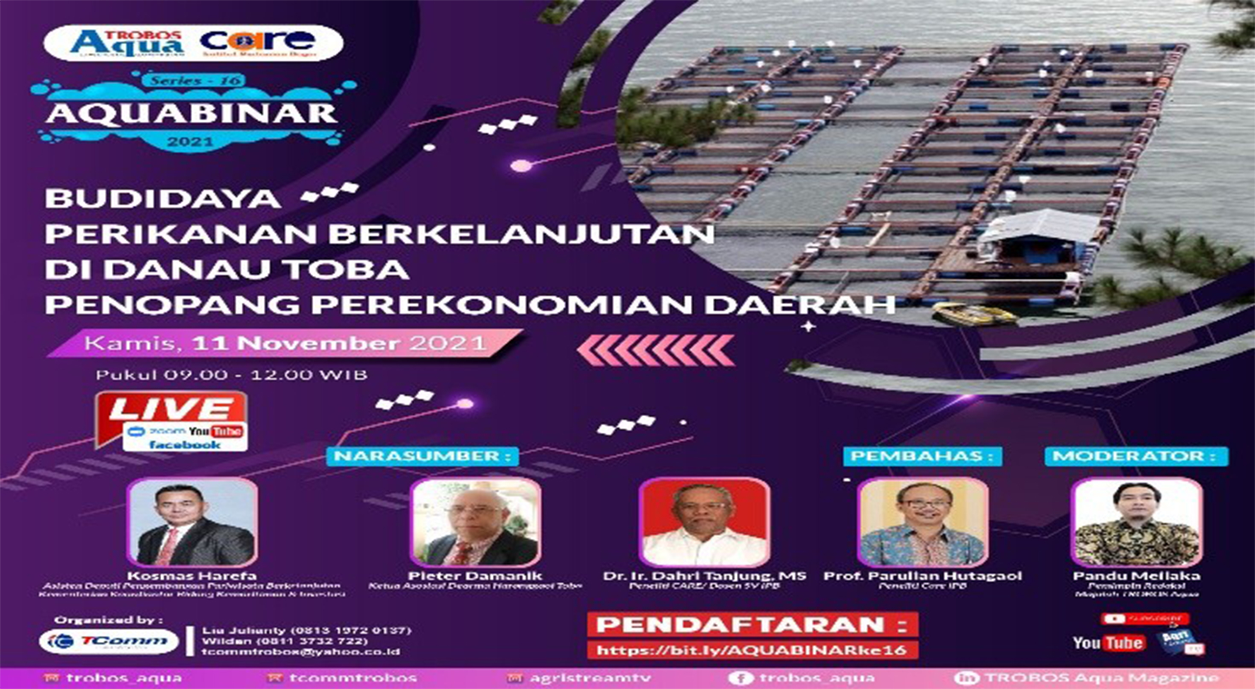 Trobos Aqua mengadakan Webinar Series ke 16 dimana untuk webinar ini tema yang diangkat adalah “ Budidaya Perikanan Berkelanjutan di Danau Toba Penopang Perekonomian Daerah “.  Penetapan Danau Toba, Sumatera Utara sebagai destinasi super prioritas menuntut penataan dan zonasi keberadaan budidaya ikan di Keramba Jaring Apung ( KJA ) yang dituding sebagai pemacu pencemaran sumber daya perairan. Langkah penerbitan KJA yang saat ini mencapai 7.1207 unit  mengancam tergerusnya pendapatan dan usaha budidaya nelayan dan pelaku usaha yang perputaran ekonomi mencapai Rp 2 miliar per hari. Kementerian Koordinator Kemaritiman dan Investasi ( Kemenko Marves ) menyatakan keberadaan keramba jaring apung di Danau Toba, perlu diatur supaya ada keseimbangan antara aspek ekosistem dan ekonomi. Saat ini, jumlah KJA di Danau Toba telah melebihi enam kali dari daya dukung sumber daya airnya. Asisten Deputi Pengembangan Pariwisata Berkelanjutan Kemenko Marves – Kosmas Harefa mengatakan KJA Danau Toba perlu diatur karena keseimbangan ekosistem dan kualitas air Danau Toba menjadi prioritas. Danau Toba adalah sebuah destinasi pariwisata superprioritas, karena itu hal itu bukan alasan untuk terus mengeksplorasi habis-habisan Danau Toba, sehingga airnya tidak bisa dipertahankan kualitasnya. Untuk itu, harus diatur budi daya perikanan di kawasan danau ini, supaya ada keseimbangan kepentingan yang diinginkan. Saat ini, pemerintah sedang melaksanakan penertiban KJA milik masyarakat dan swasta yang tersebar di tujuh kabupaten kawasan Danau Toba . Ditargetkan penataan dan penertiban KJA akan terus dilakukan sampai 2023 untuk mencapai daya tampung maksimal Danau Toba. Penertiban dilakukan pada KJA yang tidak sesuai dengan zonasi Perpres 81 Tahun 2014 dan penyesuaian daya tampung maksimal Danau Toba sesuai SK No.188.44/213/KPTS/2017 sebesar 10.000 ton/tahun yang merupakan amanat dari Perpres 60 Tahun 2021 tentang Penyelamatan Danau Prioritas Nasional. Hal ini bertujuan untuk membuat status trofik Danau Toba menjadi oligotrofik serta menciptakan budi daya perikanan sebagai added value pariwisata, sehingga Danau Toba dapat menjadi destinasi pariwisata yang berkualitas dan berkelanjutan. Sebaiknya budi daya perikanan di KJA dapat menjadi nilai tambah terhadap pengelolaan Danau Toba sebagai sebuah destinasi pariwisata superprioritas. Ketua Asosiasi Dearma Haranggaol Toba – Peter Damanik menuturkan masyarakat menyambut positif atas keputusan pemerintah tersebut namun demikian keberadaan KJA ikan nila sudah beroperasi sejak awal 1990-an. Menurutnya, pemerintah semestinya memberikan ruang bagi semua elemen masyarakat tetap menjalankan usahanya. Unit usaha pendukung seperti perdagangan dan homestay. Usaha budi daya ikan KJA di Danau Toba dibagi tiga kelompok yakni penjualan ikan sebesar 50 ton/hari, pakan 80 ton/hari, dan bibit ikan 225.000 ekor/hari. Perputaran uang dari ketiga unit usaha dari KJA ini sekitar Rp 2 miliar seharinya sehingga diperkirakan perputaran uang sekitar Danau Toba dari bisnis ikan sekitar Rp 4 triliun per tahun. Kontribusi KJA terhadap perekonomian kita sangat baik dan pemerintah mendapatkan pajak dari situ, karena itu diharapkan bisnis pariwisata dan budi daya KJA dapat berjalan bersama. Namun melalui Peraturan  Surat Keputusan Gubernur Sumatera Utara Nomor 188/44/2009/KPTS/2017 tentang  Status Oligotropik Danau Toba artinya danau dengan kandungan zat hara yang yang sangat rendah sehingga perlu diperbaiki kesuburan tanahnya, dan mengacu Perda ini, Kementerian Kelautan dan Perikanan( KKP ) dan Kementerian Koordinator Bidang Kemaritiman dan Investasi ( Kemenkomarves ) menetapkan target produksi budidaya ikan dari KJA maksimal hanya 10.000 ton. Dan jika target ini dijalankan tiba -tiba maka hanya menghasilkan nilai ekonomi sebesar Rp 500 miliar saja. Ada gap senilai Rp 3,5 triliun akan hilang. Artinya dampaknya sangat luar biasa bagi masyarakat. Peneliti Care Institut Penelitan Bogor ( IPB ) – Dahri Tanjung mengatakan produksi perikanan budidaya KJA sebesar 70.000 an ton. Lokasi KJA di berbagai kabupaten Simalungun, Karo, Dairi, Silalahi, Samosir, Tanjung Bunga dan sebagian Toba. Produksi ikan nila dari budidaya KJA Danau Toba telah menjadi sumber protein murah bagi masyarakat. Harganya dibawah Rp 28.000 per kilogram ( kg ), jika masih berada di sekitar wilayah danau. Pemasaran ikan KJA Danau Toba juga ke Provinsi Sumatera Barat dan Nanggroe Aceh Darussalam ( NAD ). Menurutnya, nilai ekspor ikan nilai dari KJA Danau Toba ini mampu menembus Rp 1,5 triliun per tahun. Adapun negara tujuan ekspor ke Amerika Serikat, Kanada, Belanda, Perancis dan negara lain. Usaha budidaya ikan nila dari KJA Danau Toba relatif tidak mendapat sentuhan dari pemerintah tapi justru mampu mensejahterakan masarakat. Pencemaran KJA Danau Toba bukan menjadi satu-satunya penyebab terjadi pencemaran. Menurutnya sekor pertanian dan rumah tangga dan bisnis wisata juga memberikan kontribusi. Kajian terbaru ini tengah dalam proses finalisasi. Apabila KJA akan ditata maka semua elemen juga harus ditata bersama-sama