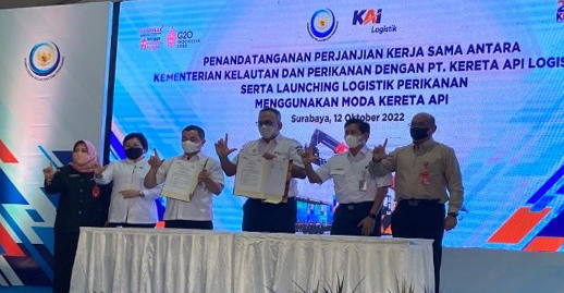 Kementerian Kelautan dan Perikanan ( KKP ) bekerja sama dengan PT Kereta Api Indonesia ( KAI ) Logistik untuk mempermudah distribusi hasil perikanan via moda kereta api. Melalui kerja sama ini diharapkan distribusi produk hasil perikanan dapat sampai tepat waktu dan terjaga mutunya. Komitmen kerja sama tersebut dituangkan dalam penandatanganan perjanjian kerja sama antara Sekretaris Jenderal ( Sekjen ) KKP – Antam Novambar dan Direktur Utama ( Dirut ) PT KAI Logistik – TLN Ahmad Malik Syah di Stasiun Kalimas Surabaya, bersamaan dengan kegiatan peluncuran logistik perikanan menggunakan moda kereta api untuk wilayah Jawa. Salah satu jenis transportasi pendukung distribusi adalah moda kereta api karena PT KAI dapat dipercaya, tidak pernah telat. Selanjutnya  para pelaku usaha di jasa logistik dapat bersinergi dalam mendukung logistik perikanan. Dalam peluncuran logistik perikanan, sebanyak 40 TEUs atau sekitar 600 ton produk perikanan akan dikirim dari Stasiun Kalimas Surabaya menuju Stasiun Kampung Bandan di Jakarta sebelum nantinya didistribusikan ke gudang beku atau unit pengolahan ikan ( UPI ). Ikan ini potensinya luar biasa, harus dimanfaatkan untuk pemenuhan protein masyarakat Indonesia. Dengan adanya potensi yang melimpah ini bayangkan berapa gerbong itu bisa digunakan. Mudah-mudahan selanjutnya nanti kereta logistik berangkat dari sini, menuju Jakarta langsung Tanjung Priok kemudian naik lagi ke kapal ( setelah diolah di UPI ) untuk ekspor. Senada, Plt Dirjen Penguatan Daya Saing Produk Kelautan dan Perikanan ( PDSPKP ) – Ishartini mengungkapkan pemilihan Stasiun Kalimas sebagai pilot project lantaran terhubung dengan Pelabuhan Tanjung Perak. Tercatat, sebanyak 109,46 ribu ton komoditas perikanan yang berasal dari Timika, Tarakan, Makasar Ambon, Bitung, Kendari, Dobo, dan wilayah Indonesia Timur lainnya masuk ke Pelabuhan Tanjung Perak selama tahun 2021. Ini jumlah yang besar dan kerjasama dengan KAI Logistik ini  mengedepankan prinsip tepat waktu, tepat kualitas, tepat kuantitas, tepat lokasi dalam upaya pendistribusian ikan. Tak hanya itu, hasil perikanan termasuk sebagai komoditas yang mudah rusak. Karenanya, diperlukan penanganan yang tepat dan cepat guna meminimalisir risiko tersebut. Kereta api merupakan moda transportasi yang memiliki perjalanan terjadwal, jaminan keamanan, kecepatan waktu, dan kapasitas daya angkut yang maksimal. Semua ini jadi pertimbangan kami untuk memperkuat kerjasama ini. Sementara Dirut PT KAI Logistik – TLN Ahmad Malik Syah, mengapresiasi langkah kolaboratif dengan KKP. Sebagai bentuk komitmen, perusahaan BUMN ini juga telah menyiapkan pengangkutan dengan kontainer berpendingin dengan kapasitas 20 feet dan 40 feet. Selain itu, fasilitas tersebut juga dilengkapi dengan ketersediaan supply electricity plugging guna memastikan ketahanan suhu dan memastikan kualitas produk dalam kontainer berpendingin. Dengan hadirnya pilihan moda kereta api ini, berharap penggiat UMKM produk perikanan dan kelautan ataupun nelayan dapat mempertahankan mutu dan meningkatkan daya jual disamping mendorong ekonomi yang berkelanjutan yang berdampak pada sektor ekonomi dan sosial. Sebelumnya, Menteri Kelautan dan Perikanan – Sakti Wahyu Trenggono mengembangkan 5 koridor sistem logistik ikan nasional ( SLIN ) sebagai upaya meningkatkan pemanfaatan sumber daya ikan untuk kesejahteraan masyarakat. Kelima koridor logistik ikan nasional yang dikembangkan adalah koridor Kendari-Jawa, koridor Mimika-Jawa, koridor Ambon-Jawa, koridor Bitung-Jawa, dan koridor Makassar-Jawa.