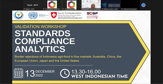 Sebagai salah satu bentuk dukungan United Nations Industrial Development Organization ( UNIDO ) dalam meningkatkan akses pasar global untuk produk dari negara produsen, termasuk Indonesia, UNIDO  mengadakan  Validation Workshop the Standards Compliance Analytics Report : Border rejections of Indonesia agri-food in five markets; Australia, China, the European Union, Japan and the United States. Border Rejection Data ( data penolakan produk di perbatasan ) merupakan data penolakan produk di perbatasan negara tidak dilaporkan dalam format yang sama. Penolakan seringkali memiliki arti/ alasan yang berbeda dari pasar yang satu dengan yang lain dimana pada dasarnya, data ini memiliki informasi mengenai negara asal produk, hasil penelitian yang menjadi basis penolakan, beberapa klasifikasi produk, tanggal penolakan, nilai/volume ( tidak semua ).  Perdagangan internasional produk pangan dan non-pangan diatur oleh regulasi dan standar teknis yang semakin lazim dan terus berkembang. Banyak negara menghadapi tantangan dalam memenuhi persyaratan keamanan pangan dan/atau mutu yang ditetapkan oleh regulasi dan standar. Perlu mengidentifikasi dimana tantangan terbesar yang dihadapi dalam pemenuhan terhadap standar, dalam konteks perdagangan ini berarti identifikasi produk dan pasar dengan tingkat ketidaksesuaian tertinggi. Di satu sisi, Indonesia memiliki posisi yang kuat dalam ekspor produk pangan dan non-pangan tertentu seperti: kelapa sawit, kakao, karet, makanan laut, dan kopi. Di sisi lain, Indonesia terus-menerus bergantung pada impor untuk memenuhi kebutuhan dasar seperti: gandum, kedelai, susu, dan daging. Untuk pasar USA selama periode 2010 – 2020, pasar USA menyumbang lebih dari setengah total pangsa penolakan produk ekspor Indonesia ( 52% ) sementara China menyumbang seperlimanya ( 20% ). Tiga pasar lainnya yaitu Australia, EU dan Jepang  memiliki persentase penolakan yang serupa ( antara 8 dan 12% ). Selain itu, jumlah agregat penolakan ekspor pangan dan pakan Indonesia untuk 5 pasar tersebut mengalami penurunan sebesar 56% selama periode 2010 – 2020, dari 438 menjadi 192. Pangsa penolakan produk oleh China berfluktuasi secara signifikan ( 7% pada 2010, 53% pada 2016, dan 8% pada 2018 ) tetapi secara keseluruhan tidak menurun. Sebagai salah satu pasar ekspor utama Indonesia, penting bagi Indonesia untuk fokus mengurangi penolakan produk oleh China. Untuk pasar Australia, pangsa total penolakan produk meningkat secara signifikan, dari 6% pada tahun 2010 menjadi 27% pada tahun 2020. Hal ini harus diselidiki lebih lanjut untuk mengetahui penyebabnya, apakah berkaitan dengan peningkatan ekspor atau faktor lainnya yang menyebabkan peningkatan ketidaksesuaian. Penolakan dari pasar UE-28 relatif stabil dan menurun dari 23 pada 2010 menjadi 7 pada 2020 ( penurunan sebesar 70% ). Penyebab utama penolakan produk Indonesia pada tahun 2020 yang mewakili 62% total penolakan adalah Kondisi/Kontrol Higienis ( 33% ) dan Kontaminasi Bakteri ( 29% ). Penyebab lainnya adalah Zat Aditif ( 8% ) dan Pelabelan ( 8% ). Indonesia harus memfokuskan upayanya untuk mengurangi dua alasan utama yang mewakili hampir dua pertiga dari total penolakan produk.