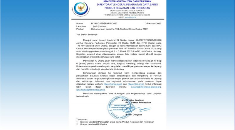 Merujuk surat Konsul Jenderal RI Osaka Nomor: B-00022/OSAKA/220126 perihal Rencana Partisipasi Perwakilan RI Osaka ( KJRI dan ITPC Osaka )